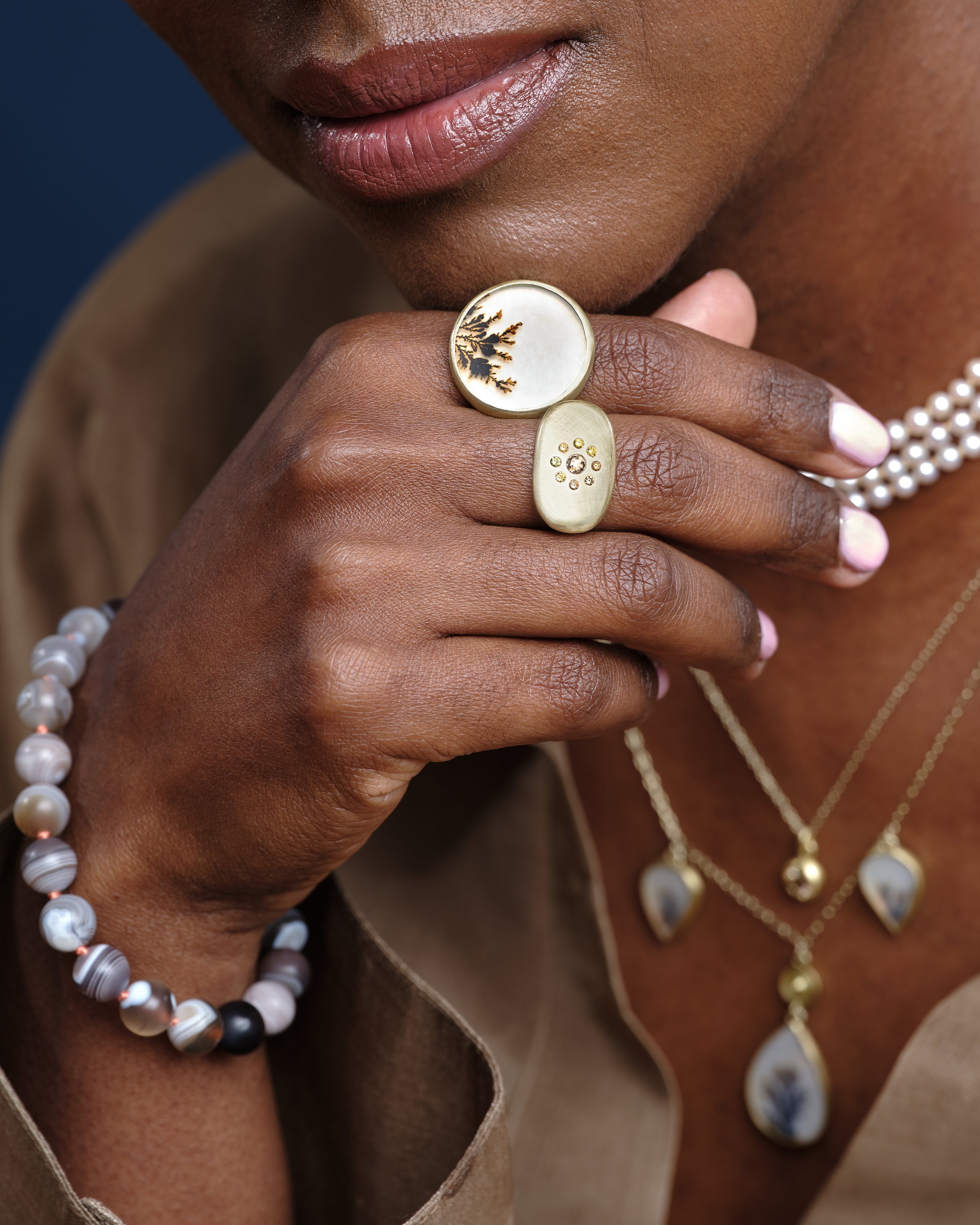 Her practice is rooted in quiet concentration, from carving wax and shaping metal to selecting gemstones that speak to her. This process infuses her work with a sense of intention and care, creating objects that feel deeply considered and enduring.